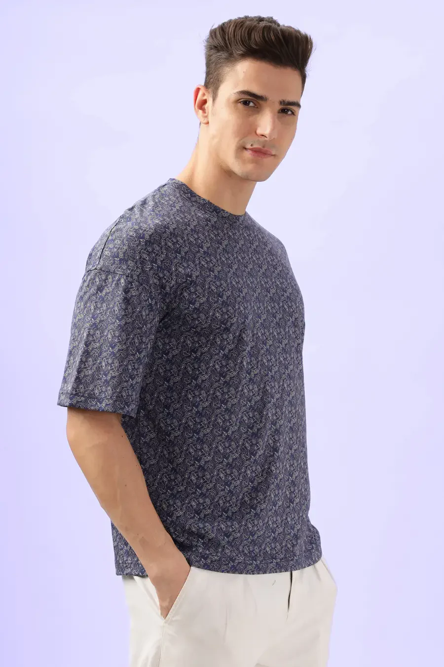 This oversized T-shirt is designed for a laid-back and comfortable fit, featuring a classic crew neckline and dropped shoulders for a relaxed silhouette. The elbow-length sleeves add a modern touch, making it an easy-to-style staple for casual and everyday wear. With its straight hem and roomy structure, this T-shirt offers effortless movement and an effortlessly cool aesthetic.