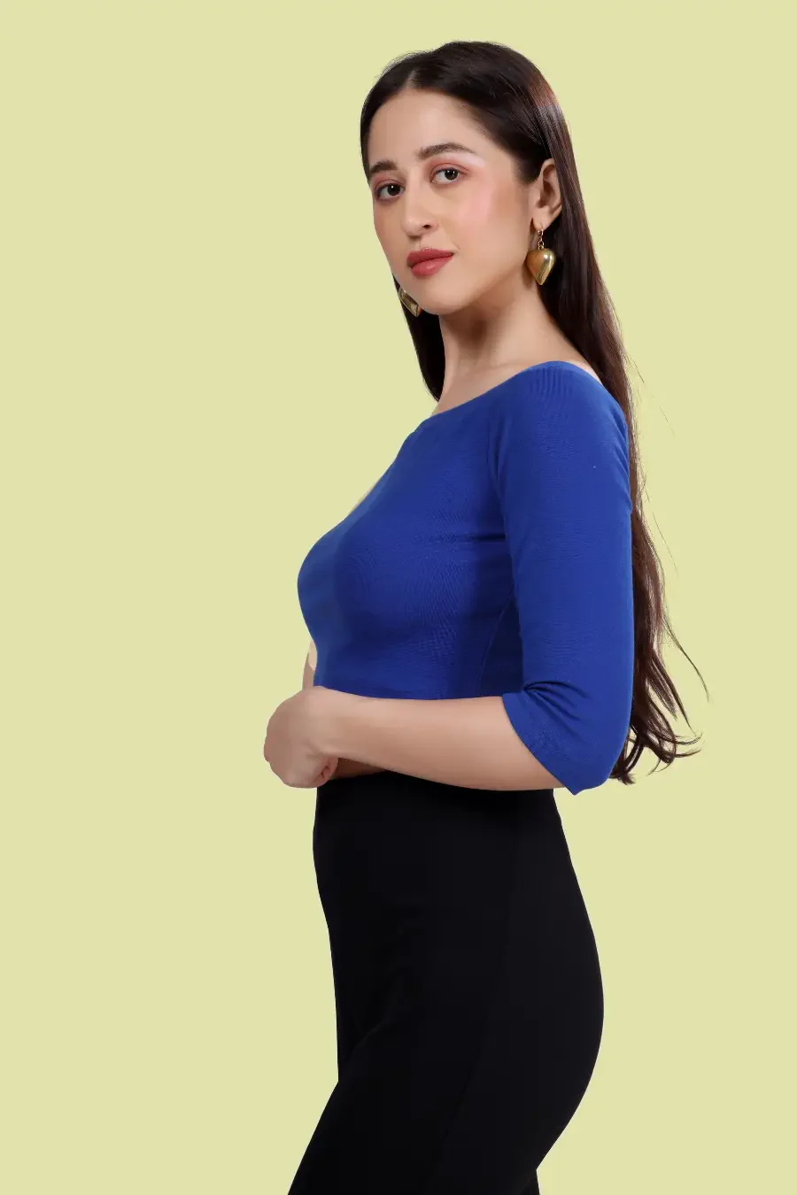 This off-the-shoulder cropped top features a sleek, fitted design with three-quarter sleeves, offering a modern and elegant silhouette. The off-the-shoulder neckline highlights the shoulders and collarbone, providing a flattering and feminine look. The cropped length adds a contemporary touch, making it a versatile piece for various occasions. Â Â