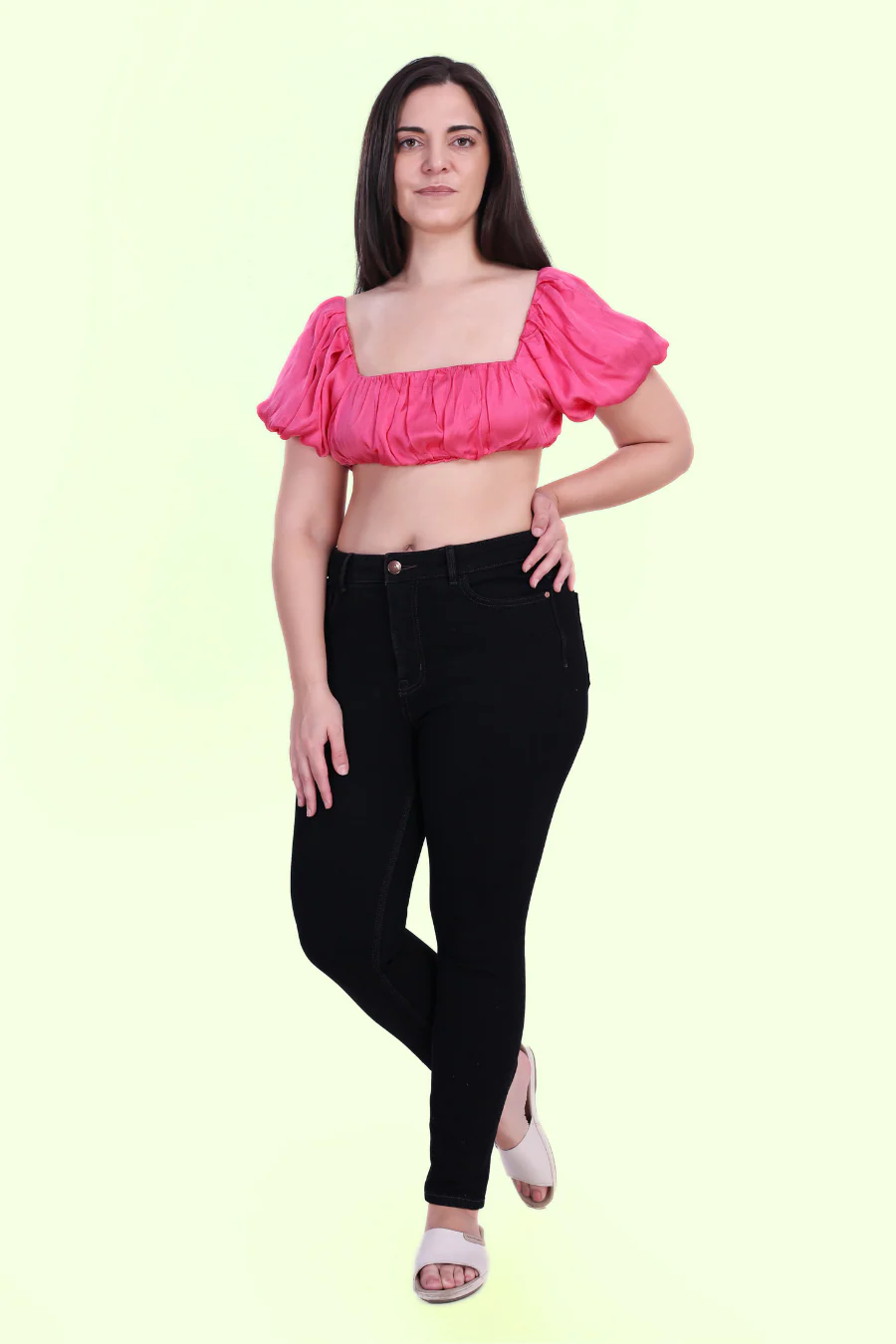 This crop top is the epitome of versatility, effortlessly paired with high-waisted trousers for a chic, sophisticated look, or with denim shorts for a playful summer vibe.