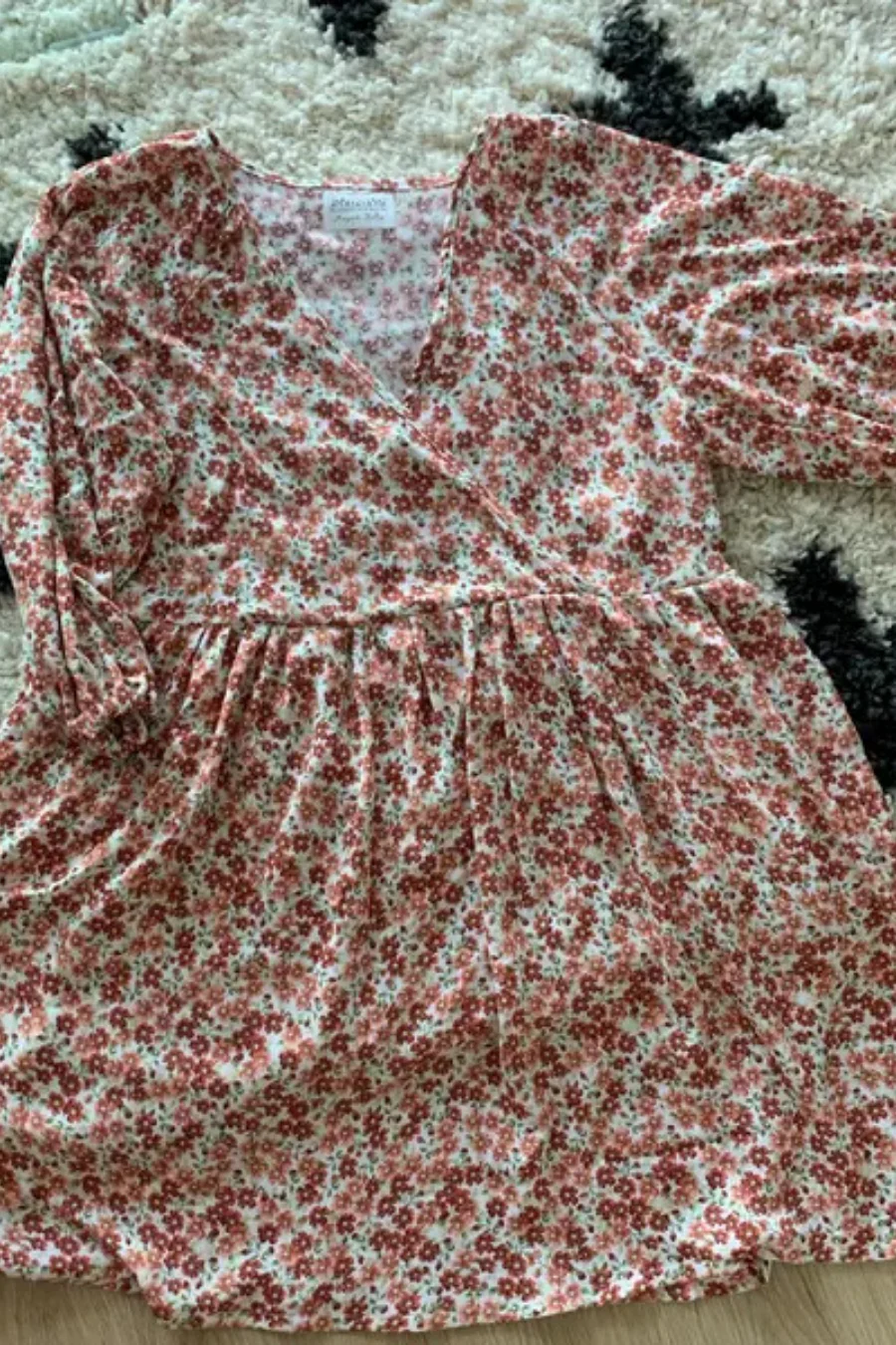 This dress features a V-neckline that complements its relaxed bodice and lantern sleeves, adding an element of graceful movement. The flared hem ensures a playful and flowing silhouette.